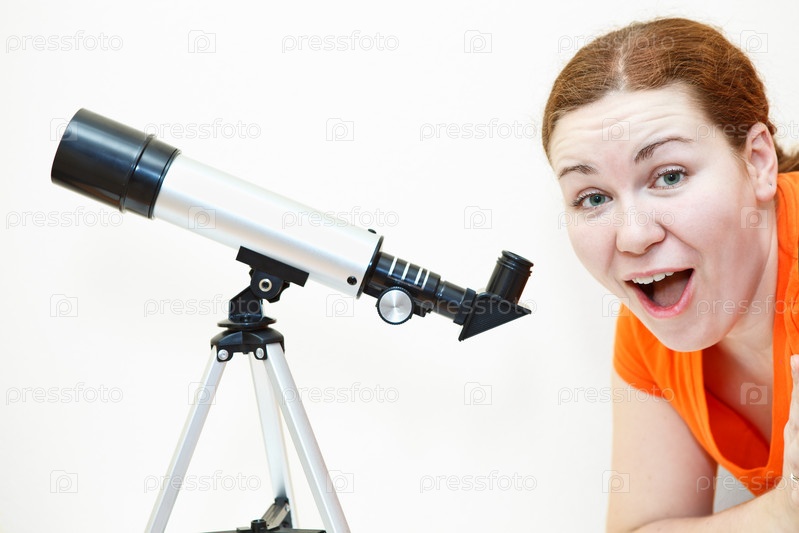 Удивленная женщина в оранжевой Футболке с телескопом на белом фоне