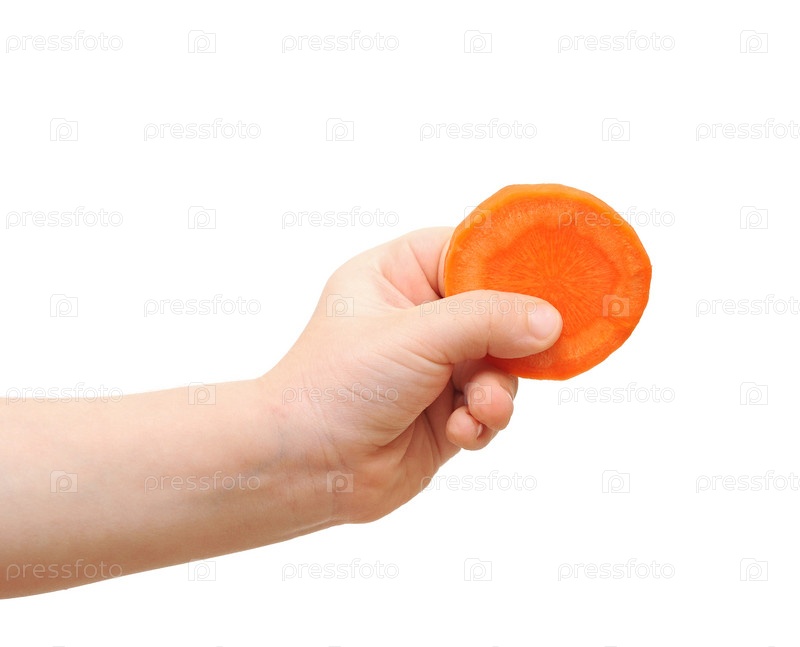Ломтик моркови в руке ребенка на белом фоне