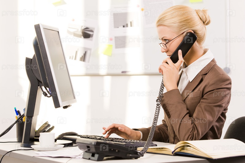 Загруженная секретарша разговаривает по телефону, в то время как печатает на клавиатуре и смотрит на экран компьютера