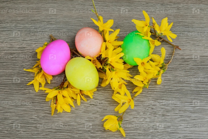 Пасхальные яйца и веточки с живыми цветами