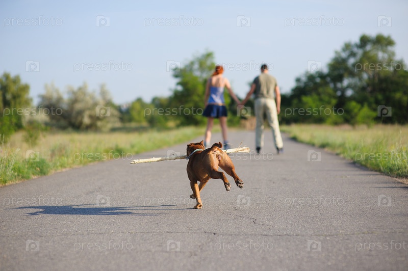 Стаффордширский терьер догоняет хозяев с большой палкой