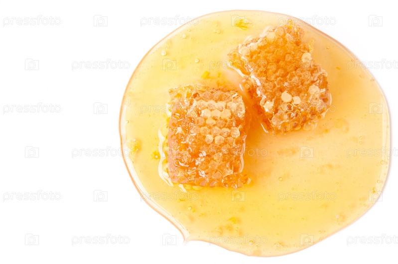 Свежий мед и соты, вид сверху, белый фон