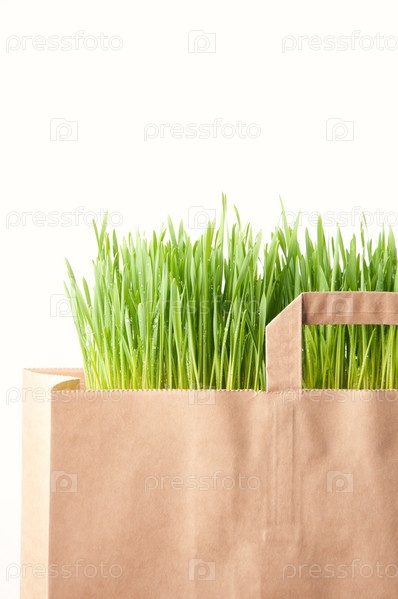 Бумажный пакет со свежей зеленой травой, изолировано на белом фоне