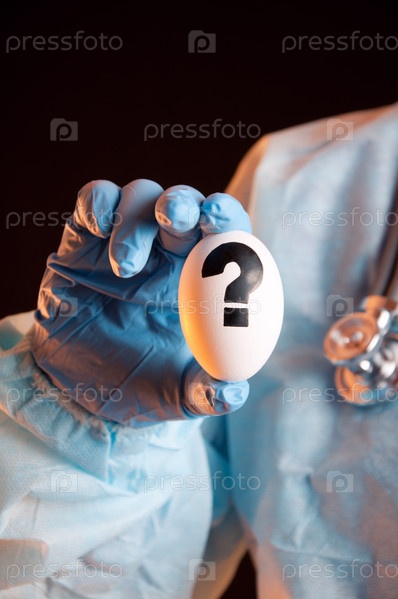 Рука ученого держит куриное яйцо с вопросительным знаком, крупный план