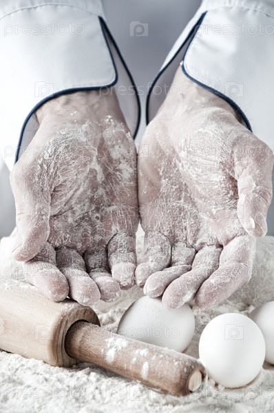 Крупным планом ладони пекаря, покрытые мукой