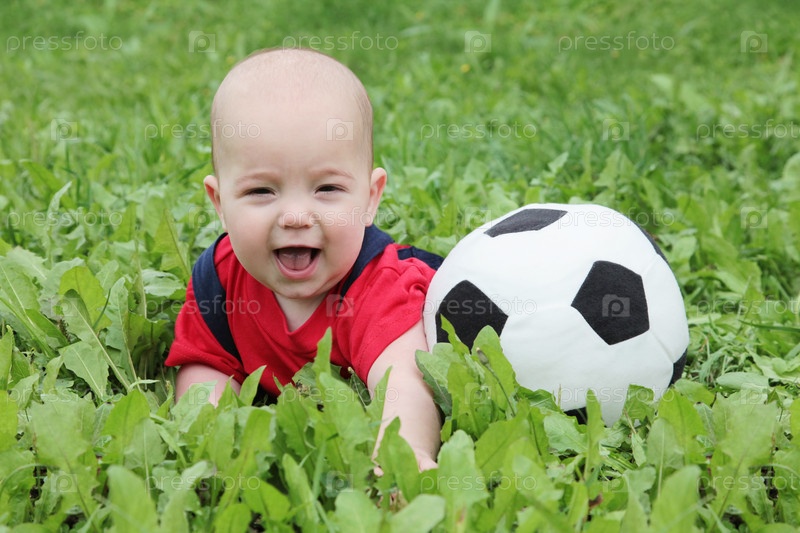 Маленький ребенок с футбольным мячом на лужайке