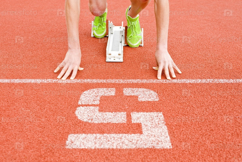 Спортсмен на старте на беговой дорожке под номером "пять"