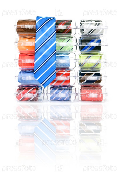 Галстук на фоне подарочных пластиковых коробок с галстуками