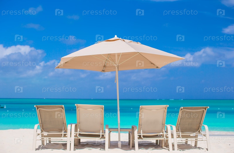 Белые зонтики и шезлонги на пляже