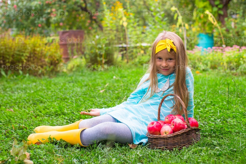 Красивая девочка с корзинкой красных яблок
