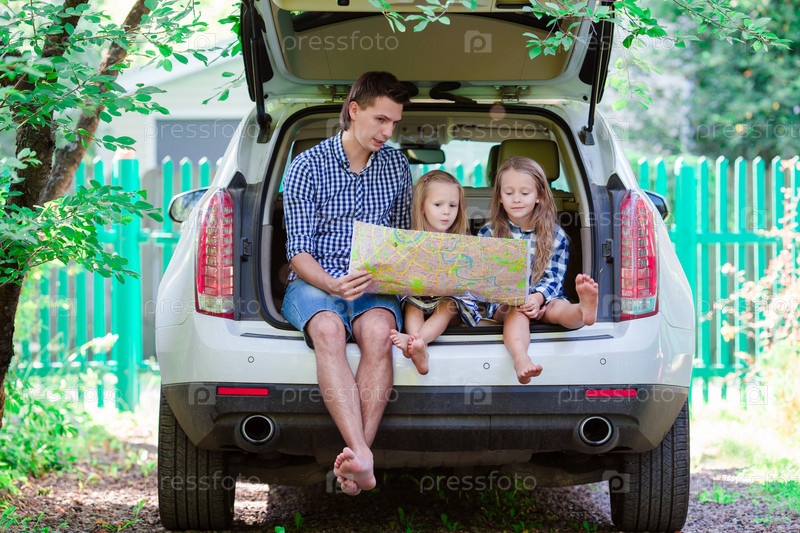 Отец с дочками рассматривают карту
