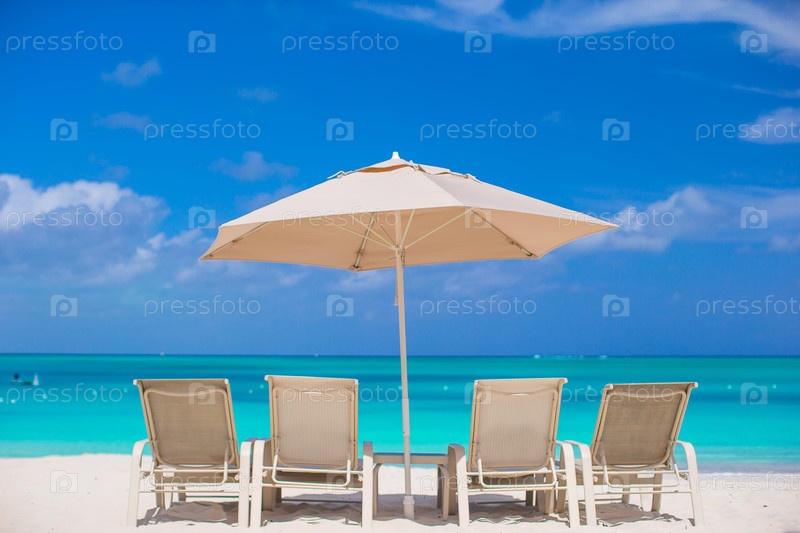 Белые зонтики и шезлонги на пляже