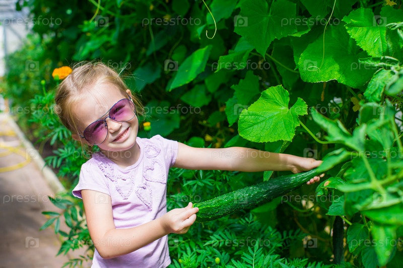 Милая маленькая девочка собирает огурцы