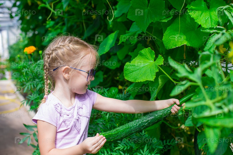 Милая маленькая девочка собирает огурцы