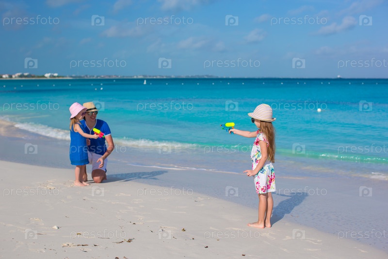 Отец играет с дочерьми на пляже