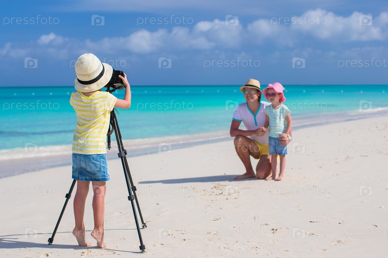 Маленькая девочка снимает отца с сестрой