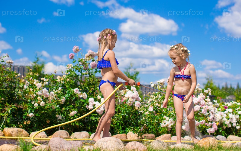 Две маленькие сестренки играют в саду