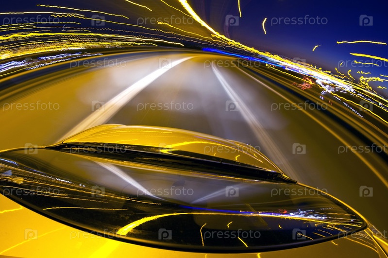 Желтый автомобиль едет на большой скорости по автомагистрали