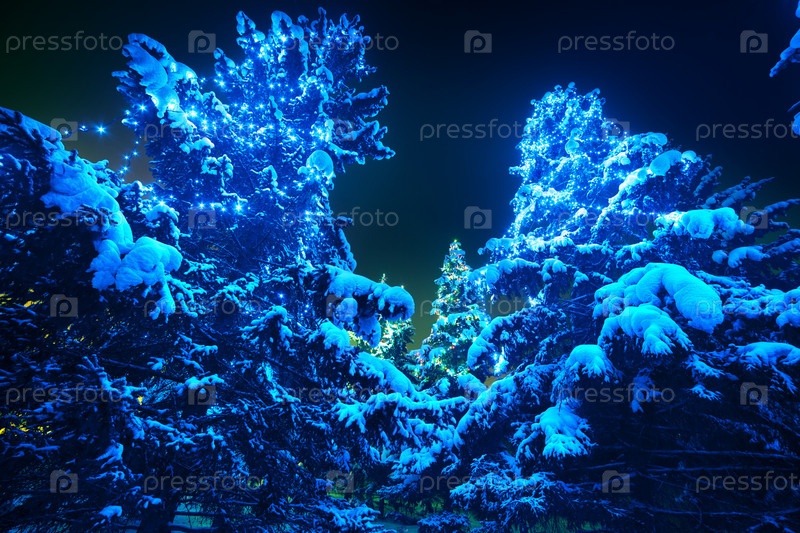 Заснеженные елки в гирляндах