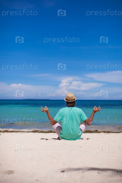 Молодой человек сидит в позе лотоса на пляже