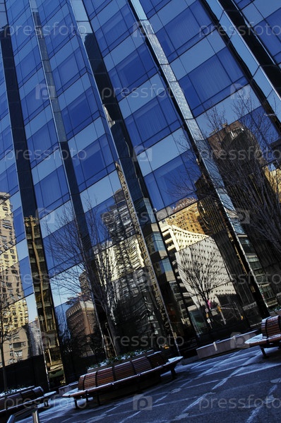 Отражение близлежащих зданий в стене башни Трампа на площади Колумба, Нью-Йорк, США
