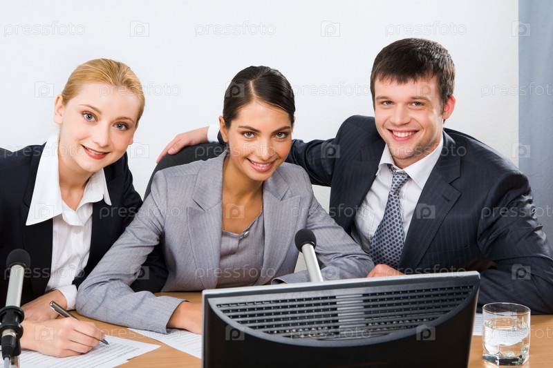 Четыре успешных молодых человека сидят в очереди перед мониторами и микрофонами, разговаривая друг с другом