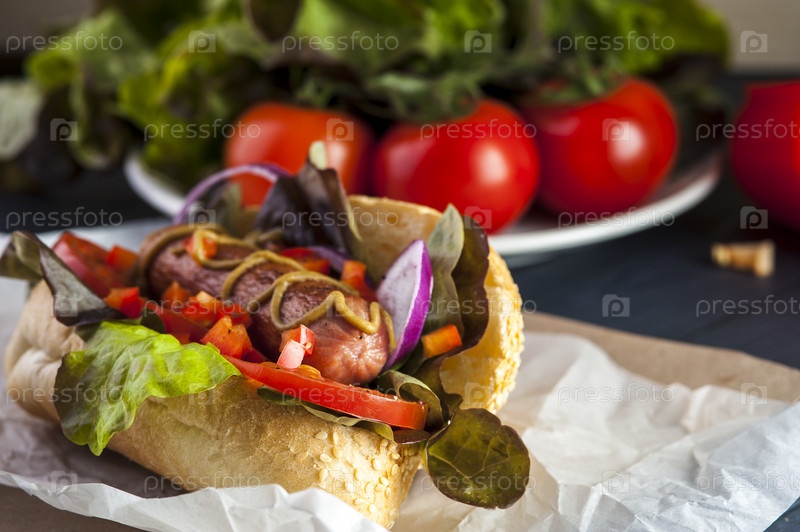 Вкусный хот-дог с овощами