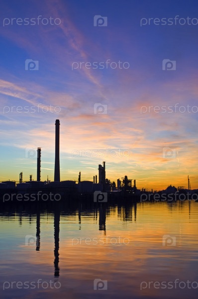 Силуэт нефтеперерабатывающего завода на закате