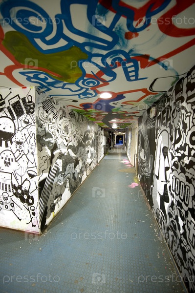 Зловещий темный коридор со стенами и потолком, покрытыми граффити