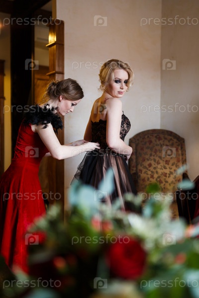Подруга помогает невесте одеться