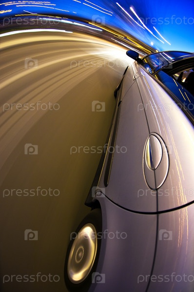 Автомобиль движется на высокой скорости по изогнутому участку автомагистрали