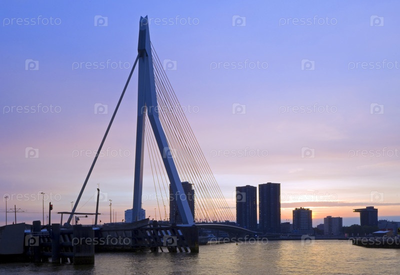 Знаменитый подвесной мост Эразма и небоскребы в вечернем Роттердаме