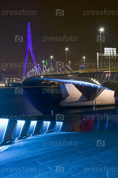 Знаменитый подвесной мост Эразма и небоскребы в ночном Роттердаме