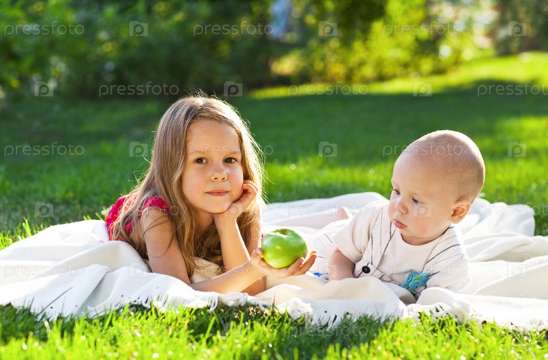 Двое детей на зеленом лугу