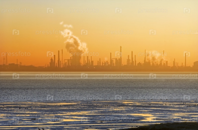 Силуэт химического завода на берегу реки во время заката