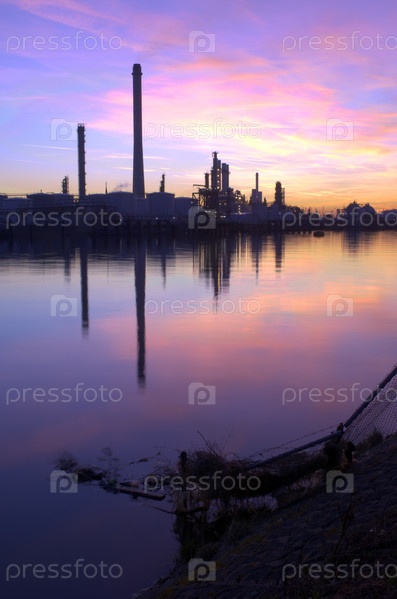Нефтеперерабатывающий завод в коммерческой гавани во время заката