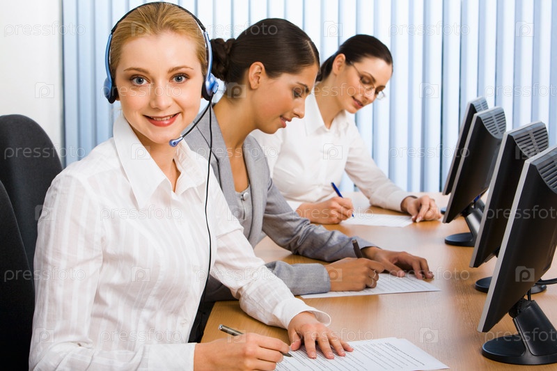 Портрет улыбающейся блондинки-бизнесмены с голубыми гарнитурами, смотрящей на камеру, сидящую за столом с монитором, микрофоном и двумя деловыми женщинами, заполняющими формы на заднем плане