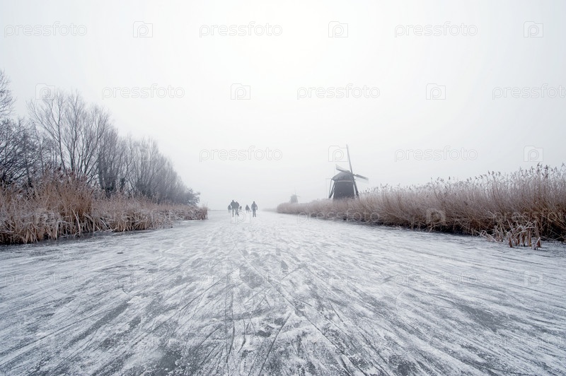 Туманное зимнее утро на покрытом льдом канале