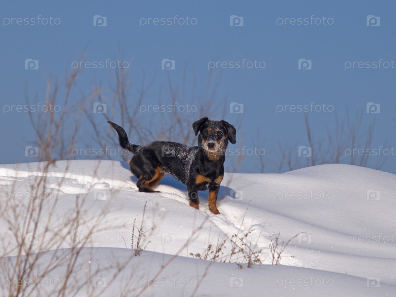 Маленькая собака, стоящая на заснеженном холме