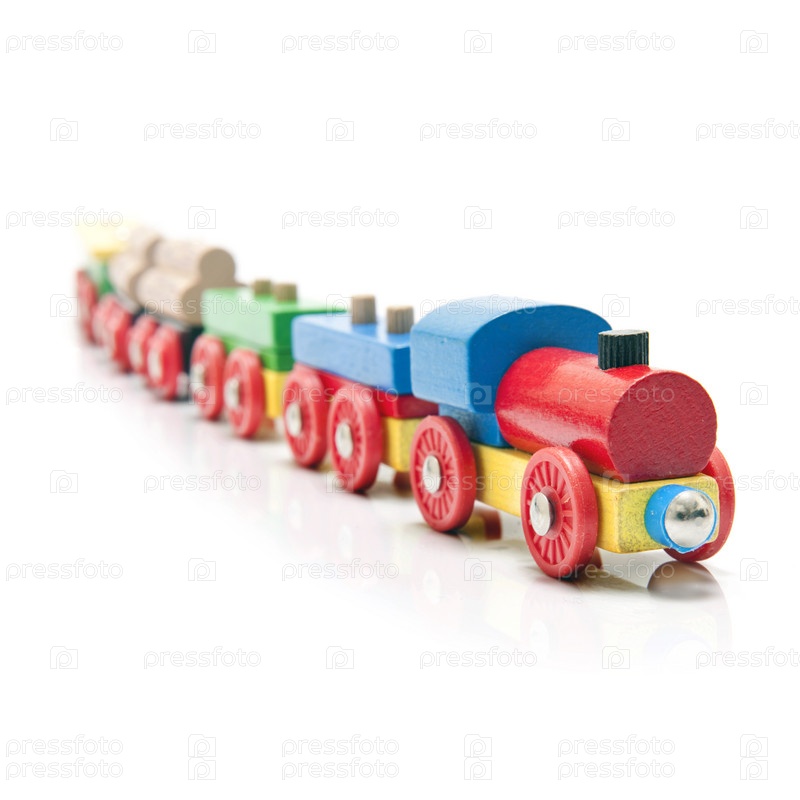 Деревянный поезд из пяти вагонов на белом фоне