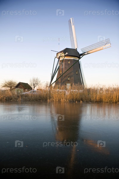 Типичная голландская ветряная мельница купается в теплом солнечном свете зимнего утра