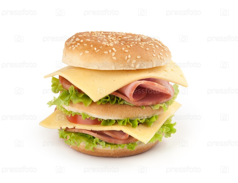 Сэндвич с ветчиной, сыром и овощами на белом фоне
