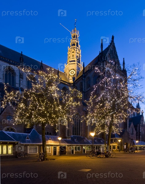 Церковь Святого Бавона и два дерева с гирляндами, Харлем, Нидерланды