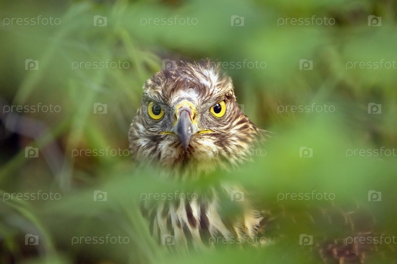 Обыкновенный канюк смотрит в камеру через густую листву