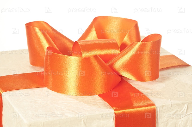 Коробка с большим оранжевым бантом на белом фоне
