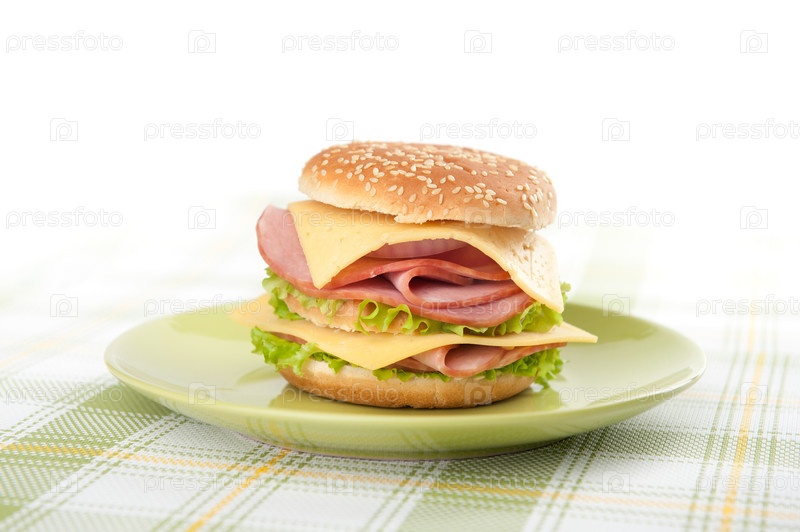 Большой гамбургер с салатом, помидорами, ветчиной и сыром