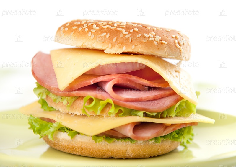 Большой гамбургер с салатом, помидорами, ветчиной и сыром