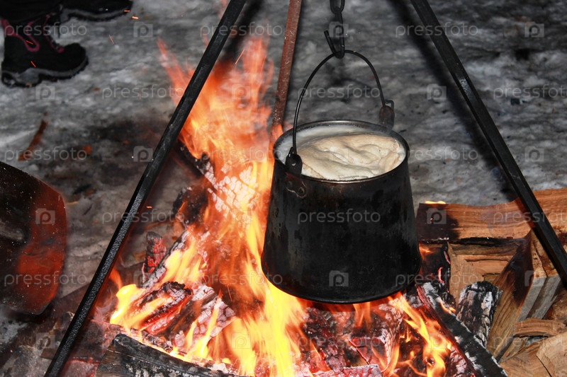 Приготовление еды в зимнем лесу на костре
