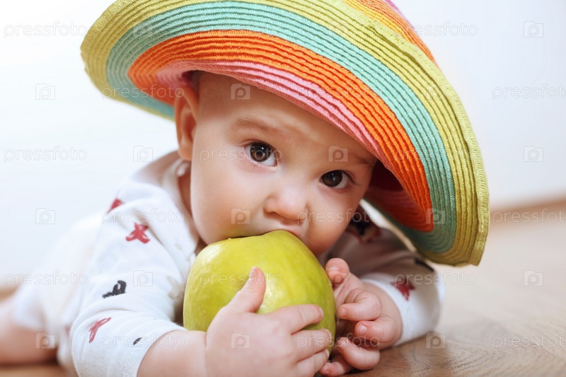Маленький ребенок в шляпе грызет яблоко
