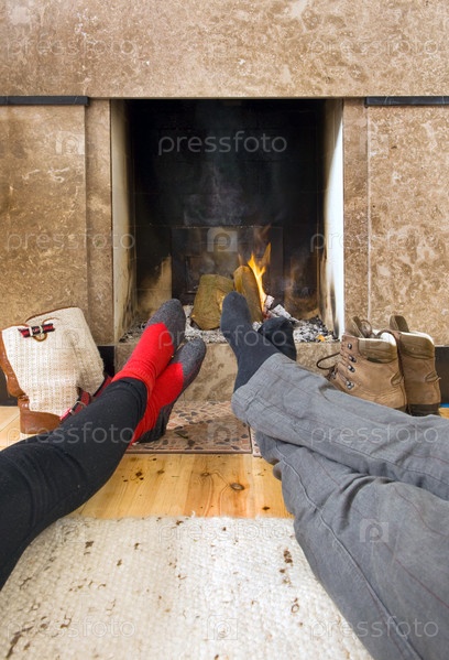 Мужчина и женщина греют ноги у камина